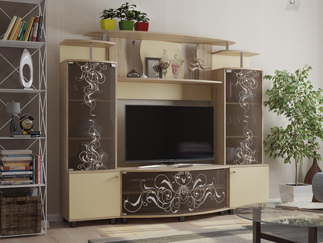 В Вашей гостиной есть место для танцев? Нет? Стенка «Зефир» позволит Вам станцевать даже вальс. В ней есть 4 гнутые витрины с элегантным рисункам и сверкающими кристаллами, 2 шкафа с полками, встроенная ТВ-тумба и полки для милых сердцу вещей. Все дверцы из стекла открываются одним нажатием. Со стенкой «Зефир» больше места для веселья и друзей!